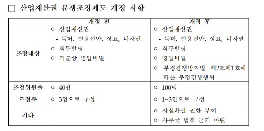 또한 조정위원 풀을 최대 100명까지 확대하고, 조정부 구성을 3인 조정위원에서 1인 또는 2인으로 구성토록 해 분쟁조정 업무를 보다 효율적으로 수행하게 된다. 아울러 조정위원회에 사실확인 권한을 부여하고, 한국지식재산보호원에 사무국을 둘 수 있는 법적 근거를 마련, 안정적 운영이 가능해질 전망이다.