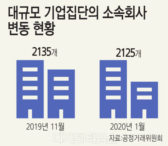 현황에 따르면 지난해 11월 초부터 올해 1월 말까지 32개 기업집단이 66개사를 편입하고, 27개 기업집단이 76개사를 제외해 소속회사 수는 총 10개 감소했다. 이에 이달 1일을 기준으로 59개 기업집단의 소속회사 수는 2125개로 집계됐다.