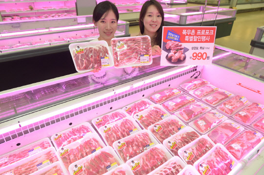 서울 농협 하나로마트 양재점이 오는 19일까지 목우촌 프로포크 삼겹살과 목심을 각각 100g당 990원에 할인 판매한다.