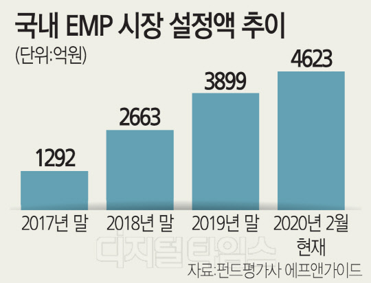 10일 펀드평가사 에프앤가이드에 따르면 국내 설정된 41개 EMP 펀드의 설정액은 총 4623억원으로 집계됐다. 연초 이후 국내 주식형펀드에서 한 달여새 2조원 넘는 자금이 썰물처럼 빠져나갔지만 EMP 펀드로는 최근 한 달 627억원의 자금이 유입됐다.