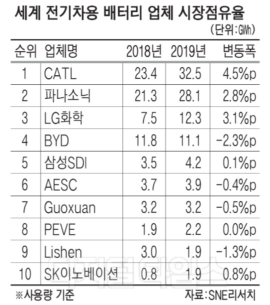 업계 1위는 중국 CATL이 차지했다. CATL은 점유율이 2018년 23%에서 지난해 28%로 늘어나며 국내 3사 합계 점유율의 2배에 가까운 점유율을 기록했다. 2위는 일본 파나소닉(24%)으로, 두 회사의 점유율이 전체의 절반을 넘는다.