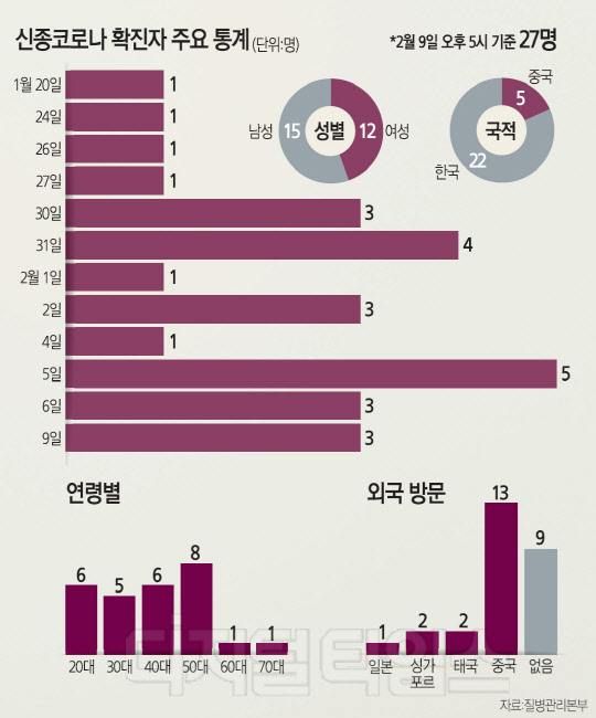 10일 중앙방역대책본부에 따르면, 지난 9일 추가로 확인된 3명의 우한폐렴 확진자들은 어머니(25번째, 73세 여자, 한국인)와 아들(26번째, 51세 남자, 한국인), 며느리(27번째, 37세 여자, 중국인)로 일가족이 감염된 사례다.
