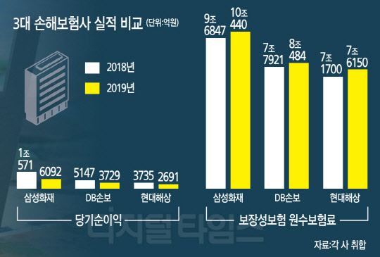 25일 디지털타임스가 빅3 손해보험사의 실적을 비교한 결과에 따르면 자산규모 상위 3개 손보사(삼성화재·DB손보·현대해상)의 지난해 누적 당기 순이익의 합은 각각 1조2512억원이었다. 이는 지난 2018년 누적 당기 순이익 1조9453억원과 비교해 35.7%(6941억원) 감소한 수치다.