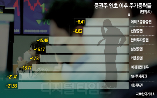 작년 말 종가기준 1만2700원이던 NH투자증권은 전주말 1만원선을 내줬다. 올 들어 21% 넘게 빠지며 지난달 28일 9980원에 거래를 마쳤다. 대신증권(-21.53%)은 증권주 가운데 가장 큰 낙폭을 기록하며 증권업지수 하락을 주도했다. 미래에셋대우(-18.77%)와 키움증권(-17.30%), 삼성증권(-16.17%), 한화투자증권(-15.48%)도 두 자릿수 하락률을 기록했다. 메리츠종금증권과 신영증권도 각각 8%대 부진을 면치 못했다. 연일 거듭된 낙폭을 이어가며 52주 신저가를 다시 쓴 결과다.
