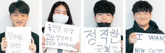 김찬우 내 삶 모두가 정치에서 비롯… 말 바꾸고 줏대없는 정치인들이 문제 홍연수 권력 싸움에 거부감 들지만 정치적 의사 밝힐 수 있는 투표 꼭 할 것 서진원 정치 뉴스 나오면 채널 돌렸는데… 사리사욕 챙기는 국회의원 싫어 황세빈 뉴페이스 좋지만 앵무새 같은 정치인 아닌 자신의 생각을 가졌으면