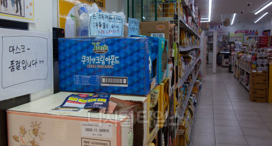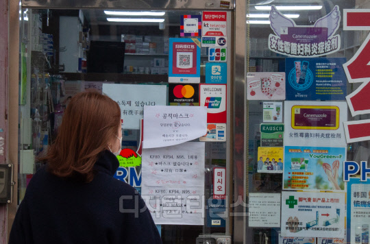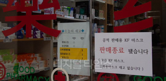 신종 코로나바이러스 감염증(코로나19) 확산 여파로 마스크 품귀현상이 이어지고 있는 4일 서울 중구 명동거리에 마스크 없음을 알리는 안내문이 보이고 있다.