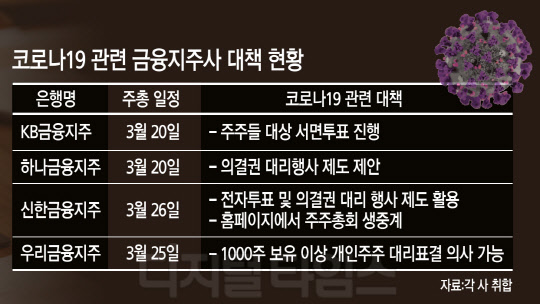 신종코로나바이러스 감염증(이하, 코로나19) 확산이 금융권 주총 모습도 바꾸고 있다. 홈페이지 생중계에서부터 전자투표 및 의결권 대리행사제도 등 다양한 방안을 강구하고 있다.