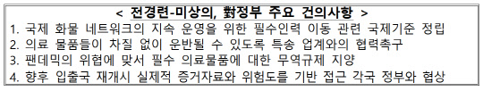 두 기관은 합의문에서 의료물자가 신속히 유통되도록 특송업계와 협력할 것을 건의했다. 의약품 등은 여객화물로 운송됐다.