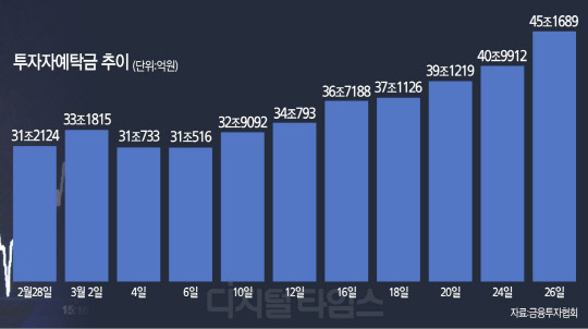 29일 금융투자협회에 따르면 투자자들이 주식에 투자하기 위해 증권사에 맡겨놓는 '투자자예탁금'이 26일 기준 45조1689억원으로 역대 최고기록을 세웠다. 지난달 말 31조원대였던 투자자예탁금은 매일 1조원씩 증가하기 시작했고 24일 급기야 40조원을 넘어섰다. 26일의 경우 하루에만 약 4조원에 육박하는 자금이 쏠렸다.