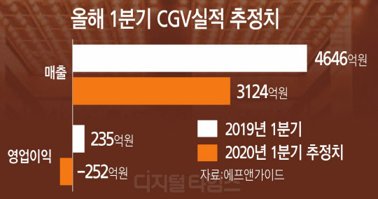국내에 이어 해외 극장까지 문을 닫게 되면서 올해 1분기 적자전환은 불가피해 보인다. 금융정보업체 에프앤가이드에 따르면 올해 1분기 CGV의 영업적자 추정치는 252억원으로 전년 동기 대비 적자로 돌아설 전망이다.