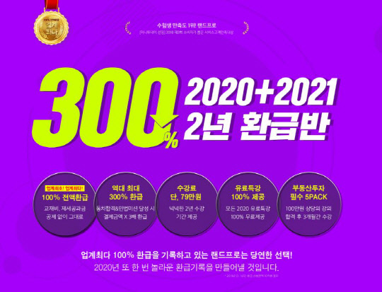 우선 300%환급반의 필두인 랜드프로 공인중개사 평생 300% 환급반은 공인중개사에 합격하기만 하면 수강료 100%를 교재비, 제세공과금 공제 없이 현금으로 환급 받을 수 있고, 31회 공인중개사시험 최종합격 및 민법미션 달성 시 수강료 300% 현금 환급이 가능하다.