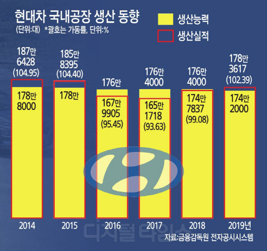 ◇현대차, 韓공장 힘차게 돌았다…4년만에 가동률 100%=2일 금융감독원 전자공시시스템에 따르면 현대차는 작년 생산능력 174만2000대인 국내공장에서 178만3617대를 생산해 가동률 102.39%를 기록한 것으로 집계됐다. 현대차 국내공장 가동률이 100%를 넘어선 것은 지난 2015년(104.4%) 이후 4년 만이다. 2016년 가동률은 95.45%에 그쳤고 2017년에는 93.63%까지 떨어졌다. 이후 2018년 99.08%까지 끌어올렸지만, 1% 부족했다.
