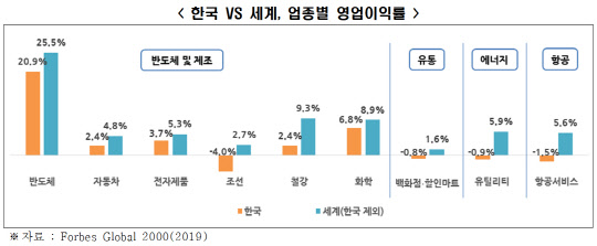 한경연 자료에 따르면 우리나라 주력 산업인 반도체를 비롯한 대표 제조업 6개 업종의 영업이익률 평균은 5.4%로, 같은 업종 해외기업 영업이익률(9.4%)의 반토막 수준이었다. 유틸리티(-0.9%), 백화점·할인마트(-0.8%), 항공서비스(-1.5%) 업종에서는 영업이익 마이너스(-)를 기록해 플러스(+) 영업이익을 낸 해외기업들과 큰 격차를 보였다.한경연은 에너지, 유통·항공 분야는 물론 반도체 등 주력 산업에서도 국내 기업의 글로벌 경쟁력이 떨어진다고 설명했다.