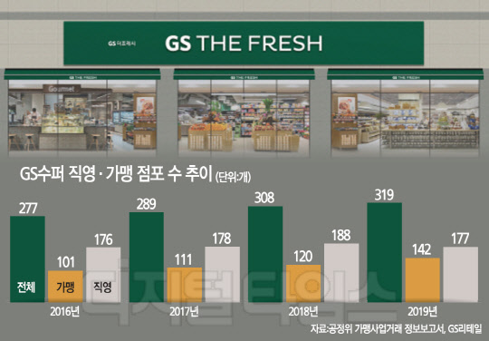 6일 공정거래위원회 가맹사업거래 정보공개서와 GS리테일에 따르면 지난해 GS수퍼의 점포 수는 전년 대비 11개 늘어난 319개로 조사됐다. 직영점은 188개에서 177개로 11개 줄었고 가맹점은 120개에서 142개로 늘었다. 앞선 2018년 가맹점이 9개, 직영점이 10개 늘어나는 등 비슷한 수준을 유지한 것에 비교하면 차이가 크다.