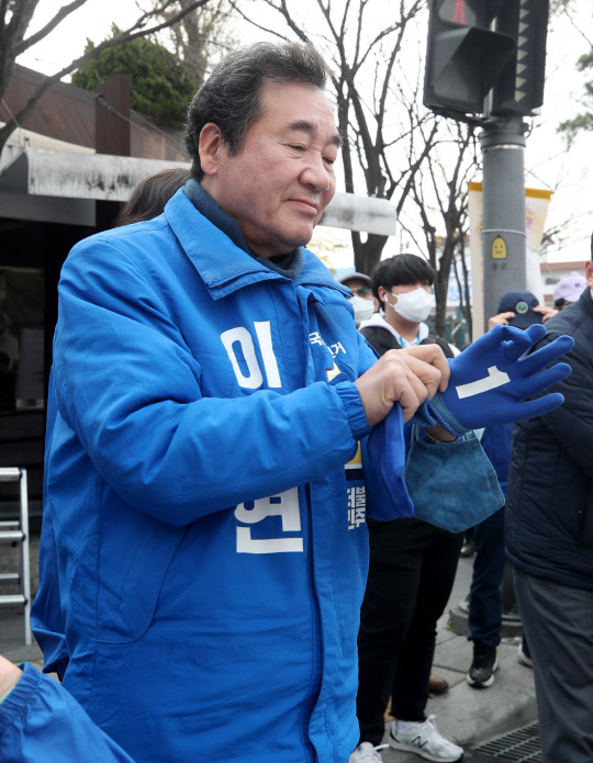 서울 종로에 출마한 더불어민주당 이낙연 후보가 7일 종로구 재동초등학교 앞 교차로에서 유세 차량에 오르기 전 장갑을 착용하고 있다.