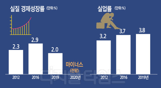 우리나라 명목 국내총생산(GDP)은 2012년 1377조원에서 2016년 1642조원, 2019년 1913조원으로 4년 단위로 약 300조원씩 증가했다. 하지만 실질 경제성장률은 2012년 2.3%에서 2016년 2.9%로 올라갔지만, 2019년 성장률은 2.0%로 하락했다. 올해 경제성장률은 국제통화기금(IMF) 등 국제기관을 비롯해 해외 투자은행과 S&P 등 신용평가사들 모두 코로나19 경제충격에 '마이너스'를 기록할 것으로 전망하고 있다. 내년 성장률도 1%대를 기록할 것으로 예상되는 등 당분간 저성장 기조를 이어갈 것으로 예상하는 전망이 지배적이다. 경상수지 흑자 규모도 2012년 488억달러에서 2016년 972억달러로 올랐다가 지난해 599억달러로 감소했다. 올해 경상수지 흑자 규모는 더 줄어들 것으로 보인다.