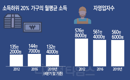하지만 대표적 서민층인 소득 하위 20%인 1분위 가구의 월평균 소득은 2012년 135만2000원에서 2016년 144만7000원으로 늘었지만, 2019년 4분기엔 132만4000원으로 떨어졌다.