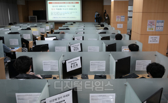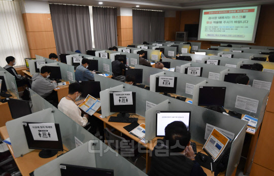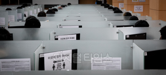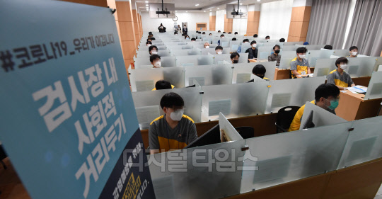 신종 코로나바이러스 감염증(코로나19)으로 8주 동안 중단됐던 병역판정 검사가 재개된 20일 영등포구 서울지방병무청에서 입대 예정자들이 앉는 책상마다 사회적 거리두기 실천을 위한 칸막이가 설치되어 있다.