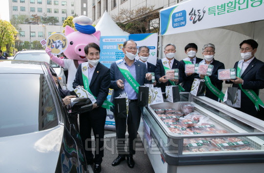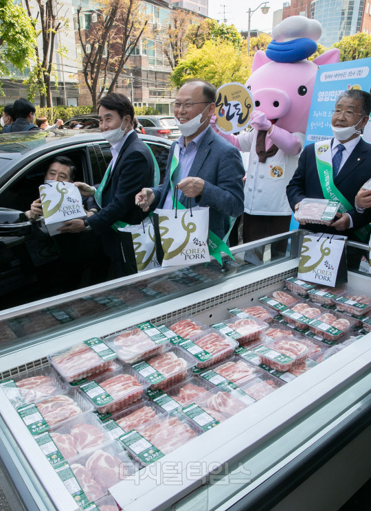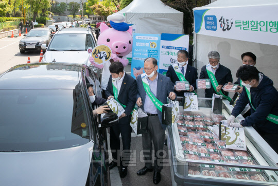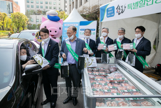 24일 서울 강동구 농협중앙회 서울지역본부에서 열린 한돈 드라이브스루 할인행사에서 하태식 한돈자조금 위원장, 김태환 농협경제지주 대표 등 임직원 및 관계자들이 한돈을 판매하고 있다. 한돈자조금과 농협경제지주는 신종 코로나바이러스 감염증(코로나19) 여파에 따른 사회적 거리두기 이슈와 판매가 어려운 우리 축산물 판매 촉진을 위해 이번 행사를 기획했다.