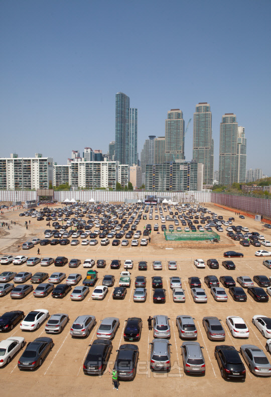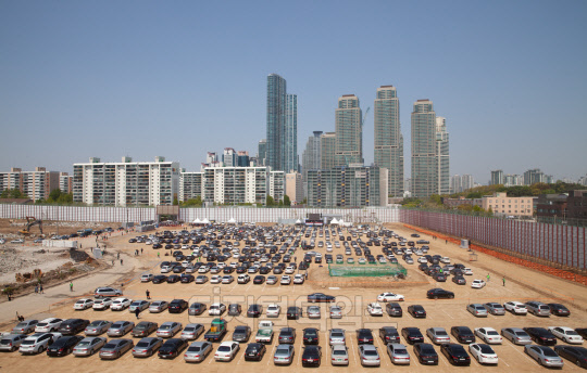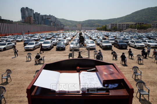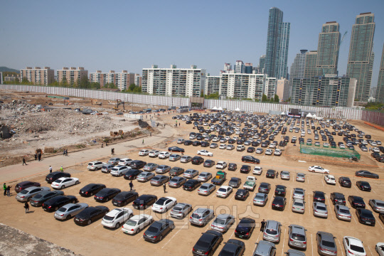 28일 서울 강남구 개포주공1단지 내 공터에서 개포주공1단지 재건축 조합 '드라이브 스루'(DRIVE THROUGH) 형식의 관리처분변경총회가 열리고 있다. 많은 수의 조합원들은 차량에 탑승한 상태에서 총회에 참가했다.