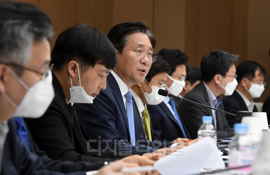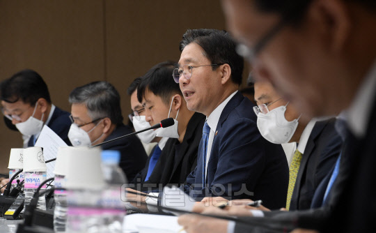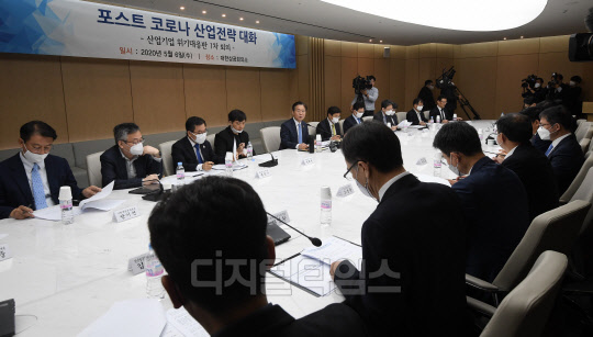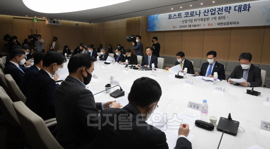 성윤모 산업통상자원부 장관이 6일 서울 중구 대한상공회의소에서 신종 코로나바이러스 감염증(코로나19) 이후 글로벌 산업 질서 변화에 대응하기 위해 열린 '포스트 코로나 산업전략 대화 및 산업·기업 위기 대응반 1차 회의'에서 인사말을 하고 있다.
