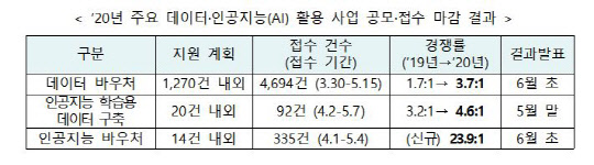 한편 올해 처음 실시된 인공지능 바우처 사업은 AI 솔루션 적용을 희망하는 중소기업을 대상으로 인공지능기술 도입을 지원해주는 사업이다. 해당 사업은 총 14건 모집에 총 335건이 접수돼 24:1의 높은 경쟁률을 기록했다.