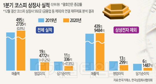 19일 한국거래소가 코스피시장 12월 결산 652개 회사 중 금융사를 제외한 592개 기업의 1분기 실적(연결기준)을 분석한 결과에 따르면 영업이익(19조원)이 전년 동기 대비 31.2% 급감했고, 당기순이익(11조원)은 47.8% 떨어졌다.