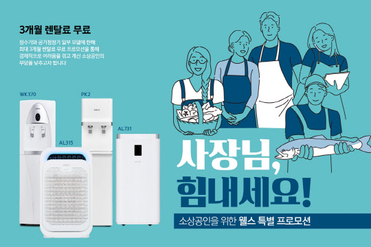 웰스는 이달 말까지 이벤트 제품 렌탈 신청자를 대상으로 등록비 및 최대 3개월 렌탈료 면제, 특별할인 렌탈료를 적용한다. 이벤트 제품은 사무실, 중소형 매장, 식당, 숙박업소 등에 적합한 '웰스 스탠드 정수기 2종'(모델명 : PK2, WK370)과 '웰스 공기청정기 2종'(16평형, 31평형) 이다. 이번 이벤트를 통해 30평형 웰스 공기청정기를 렌탈 할 경우, 약정 기간 내 총 81만원 가량을 할인 받을 수 있다.