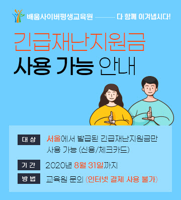 긴급재난지원금으로 신청 시에도 배움사이버평생교육원의 할인 혜택을 동일하게 적용받을 수 있다. 평생회원으로 가입 시 1만원 쿠폰 및 무료 수강의 혜택이 제공되고, 타 기관 수강 인증 시 기존 할인 금액에서 최대 4만 원까지 추가 할인이 가능하다. 추천인 이벤트를 통해 가입하면 신규 회원에게 1만 원, 추천 회원에게 2만원 상품권이 제공된다.