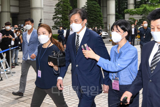 가족 비리와 감찰 무마 의혹 사건 등으로 기소된 조국 전 법무부 장관이 5일 서초구 서울중앙지방법원에서 열린 속행 공판에 출석하고 있다.