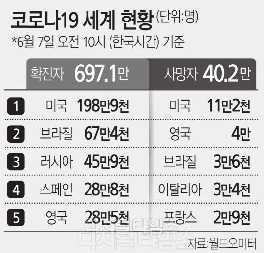 전 세계 신종 코로나바이러스 감염증(코로나19) 확진자 수가 700만명을 넘어섰다. 사망자는 40만명을 돌파했다.