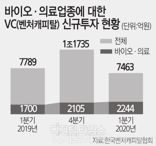 실제로 1분기 전체 VC 신규 투자액은 지난해 7789억원 대비 약 4.2% 감소했다. 반면 같은 기간 바이오·의료 분야는 오히려 1700억원에서 2244억원으로 약 32.0%나 급증했다.