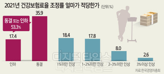 건강보험 보장성 강화대책 이후 3년간(2018∼2020년) 건강보험료율 인상률을 두고 응답자 79.0%가 높다고 답했다. 건강보험료율은 보수월액 대비 2017년 6.12%에서 올해 6.67%로 올랐다. 건강보험 혜택 확대는 필요하지만 보험료율 인상은 반대한다는 답변이 39.6%였다. 건강보험 혜택과 보험료율을 현재 수준에서 유지해야 한다가 31.1%였고 둘 다 줄이고 인하해야 한다가 5.8%였다. 건강보험 혜택 확대를 위해서는 보험료율 인상에 찬성한다는 답변도 20.8%에 달했다.