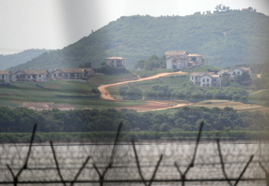 북한이 남측을 '적'으로 규정한데 이어 군사 행동에 나설 것을 공식화한 가운데 14일 파주 임진강 철책선 너머로 북한 황해북도 개풍군 일대가 보인다.