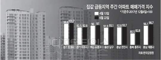한국감정원 주간 아파트 매매가격지수(2017년12월4일 100 기준)를 보면 4월13일 각각 99.8, 92.5였던 김포시와 파주시는 6월22일 기준 101.7, 92.6으로 1.9포인트, 0.01포인트 각각 상승했다.