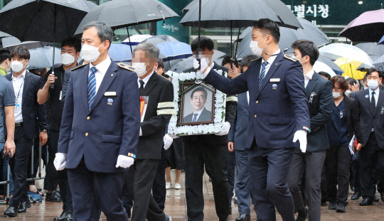 고(故) 박원순 서울시장의 영정이 13일 오전 서울시청에서 영결식을 마친 뒤 청사를 나서고 있다.