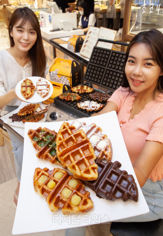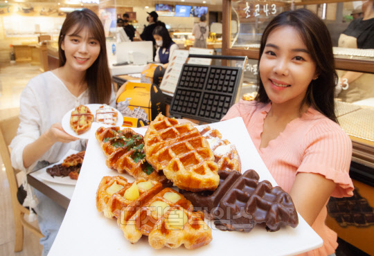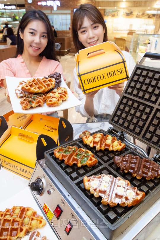 롯데백화점 모델들이 14일 서울 중구 본점에서 크로아상 반죽을 와플 모양으로 찍어내 바삭함과 맛을 살린 디저트 '크로플'을 소개하고 있다. 롯데백화점은 크로플로 유명한 '크로플하우스' 팝업 매장을 본점 식품관에서 선보인다.