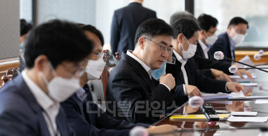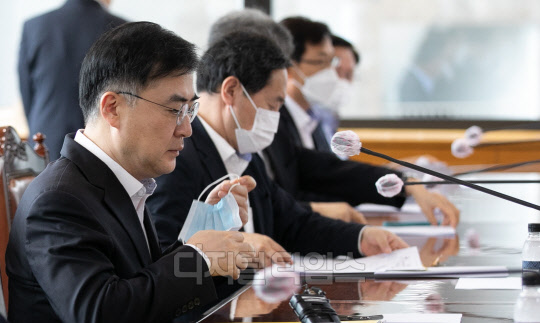 손병두 금융위원회 부위원장이 14일 서울 중구 은행회관에서 열린 제12차 경제중대본 금융리스크 대응반 회의에서 모두 발언을 위해 마스크를 벗고 있다.