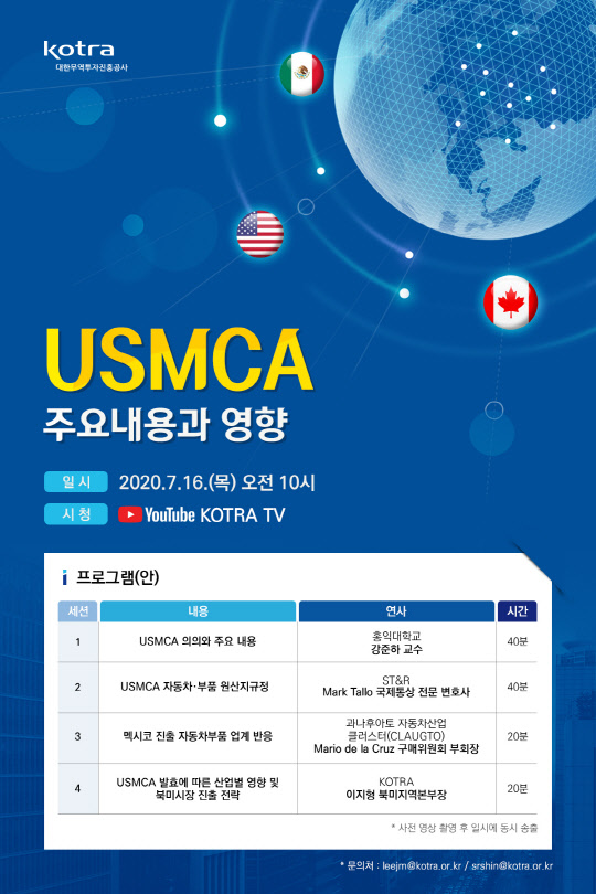 코트라(KOTRA)는 자동차 등 우리 주력품목의 미국 수출전략과 현지 진출기업의 대응방식에 변화가 필요함에 따라 오는 16일 'USMCA 주요내용과 영향'을 주제로 웹세미나를 개최한다고 14일 밝혔다.