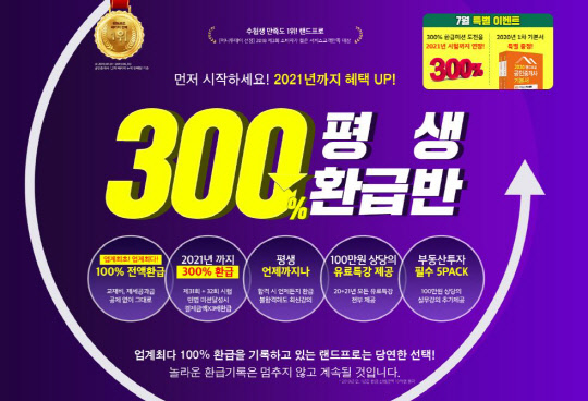 랜드프로 공인중개사 패키지 중 '평생 300% 환급반'은 공인중개사시험에 언제든지 합격하면 수강료의 100%를 전액 현금으로 환급해준다. 뿐만 아니라 7월 미션 연장 특별 이벤트를 맞아제31회 또는 제32회 공인중개사 시험에 최종 합격하고 민법 미션까지 달성하게 되면 수강료의 3배를 전액현금으로 돌려주는 혜택까지 주어진다.