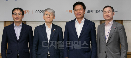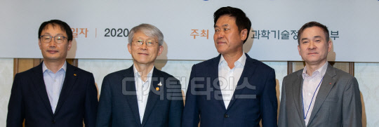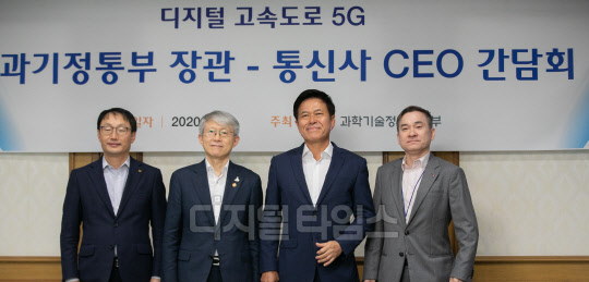 최기영 과학기술정보통신부 장관(왼쪽 두번째)이 15일 종로구 정부서울청사 국무위원 식당에서 구현모 KT 대표(첫번째)와 박정호 SK텔레콤 사장(세번째), 하현회 LG유플러스 부회장 등 통신 3사 CEO와 간담회에 앞서 기념촬영을 하고 있다.