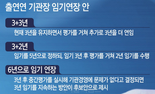 현재 출연연 기관장 임기연장 안은 크게 세 가지 안으로 압축된다. 현재 3년을 유지하면서 평가를 거쳐 추가로 3년을 더 연임할 수 있는 '3+3년', 임기를 5년으로 정하되, 임기 3년 후 평가를 거쳐 2년 임기를 수행하는 '3+2년', 6년으로 임기를 연장해 3년 후 중간평가를 실시해 기관경영에 문제가 없다고 결정되면 3년 임기를 지속하는 방안이 후보안으로 제시되고 있다.