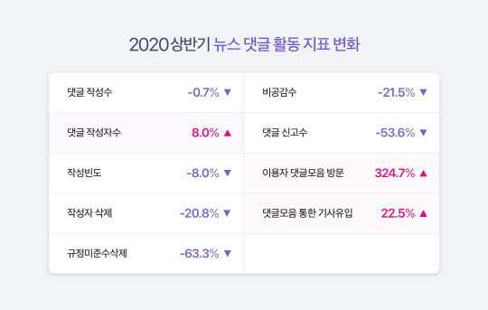 또 연초 대비 6월 댓글 수는 0.7% 소폭 감소했는데, 작성자 수는 8% 늘었다. 작성자가 직접 삭제한 댓글 수는 20.8% 감소하고, 인당 댓글 작성 빈도는 8% 줄었다. 댓글이력 공개, 본인확인제 시행이 댓글 공간 위축을 가져올 것이란 우려가 있었으나 반대로 더 많은 사용자들이 참여해 더욱 신중하게 다양한 목소리를 남기는 것으로 풀이된다.