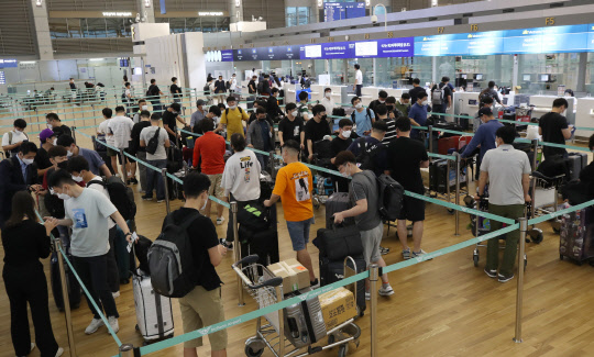 22일 인천국제공항 1터미널 출국장에서 기업인들이 베트남행 전세기 탑승수속을 위해 줄을 서 기다리고 있다.