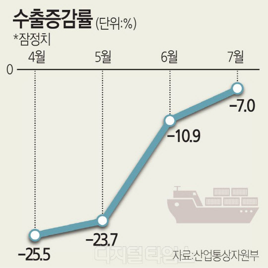 특히 우리나라 경제를 지탱하는 수출은 지난해 7월 대비 7.0% 감소한 것으로 나타나 코로나19 사태가 본격화한 이후 처음으로 감소율이 한 자릿수로 개선됐다. 우리나라 월별 수출 감소율은 4월 -25.5%, 5월 -23.6%, 6월 -10.9%로 두 자릿수를 이어왔다.