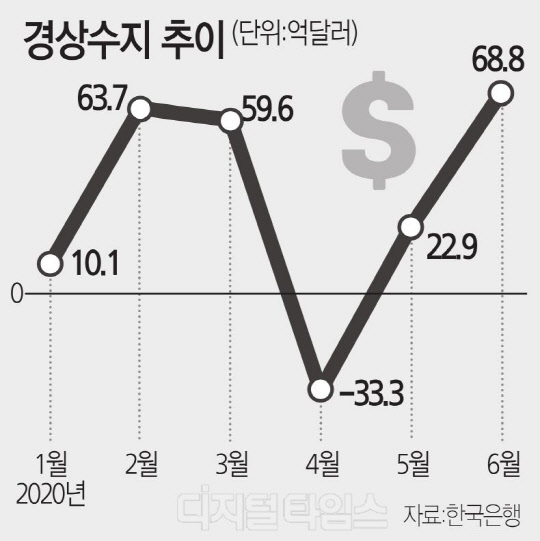 한국은행이 6일 발표한 '2020년 6월 국제수지(잠정)'에 따르면 6월 경상수지는 68억8000만달러 흑자를 기록했다. 경상수지 흑자가 78억3000만달러에 달했던 지난해 10월 이후 8개월만에 흑자폭이 가장 컸다. 경상수지란 국가 간 상품, 서비스의 수출입과 함께 자본, 노동 등 모든 경제적 거래를 합산한 통계를 말한다. 다만 올해 상반기 전체로는 경상수지 흑자가 191억7000만달러로 지난해 상반기(226억3000만달러)에 비해 약 15% 감소했다.