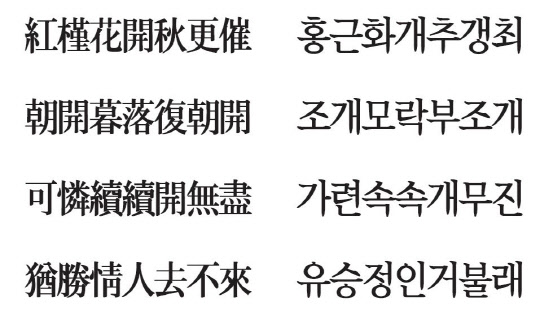 조선 전기 최고의 문장가로 꼽히는 서거정(徐居正 1420~1488)의 칠언절구다. 무궁화는 7월에 피기 시작해 9월 초까지 각 꽃봉오리를 시차를 두고 틔우며 오랫동안 꽃을 피운다. 그래서 무궁화(無窮花)다. 우리나라 국화(國花)다. 시는 무궁화의 그 '지구력'에 쉬이 식는 사람의 연정(戀情)을 빗댔다. 서거정의 호는 사가정(四佳亭)이다. 문집으로 사가집(四佳集), 필원잡기(筆苑雜記) 등이 전한다.