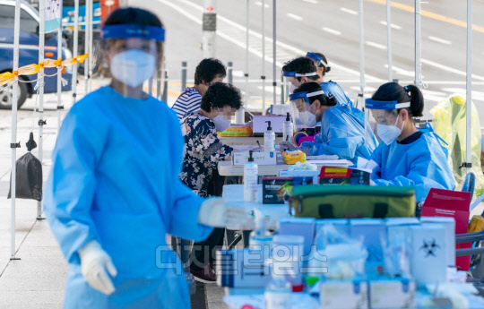 남대문시장 내 케네디상가에서 코로나19 집단감염이 발생한 10일 서울 중구 남대문시장 인근에 마련된 선별진료소에서 시민들이 검사를 받고 있다.