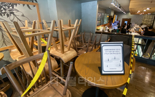 스타벅스 등 커피전문점과 프랜차이즈 매장 등에서 코로나19 소규모 집단감염이 속출하고 있는 18일 서울 한 스타벅스 매장에 탁자와 의자가 구석에 쌓여 있다. 스타벅스코리아는 야당역점 매장 등에서 코로나19 확진자가 잇따라 발생하자 서울과 경기 지역 840여개 매장 좌석을 30% 이상 축소해 운영하기로 조치했다.