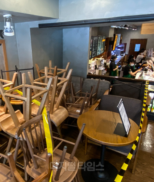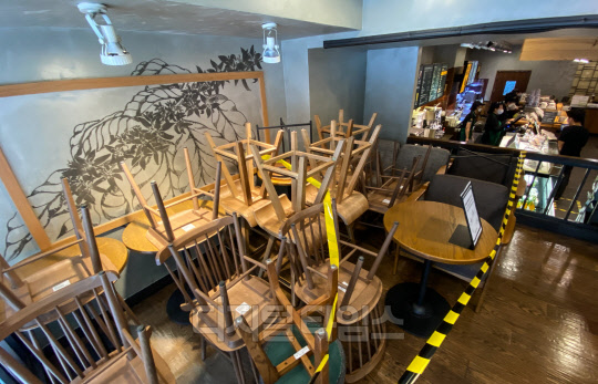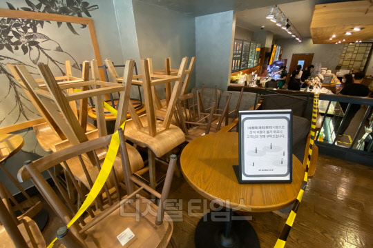 스타벅스 등 커피전문점과 프랜차이즈 매장 등에서 코로나19 소규모 집단감염이 속출하고 있는 18일 서울 한 스타벅스 매장에 탁자와 의자가 구석에 쌓여 있다. 스타벅스코리아는 야당역점 매장 등에서 코로나19 확진자가 잇따라 발생하자 서울과 경기 지역 840여개 매장 좌석을 30% 이상 축소해 운영하기로 조치했다.